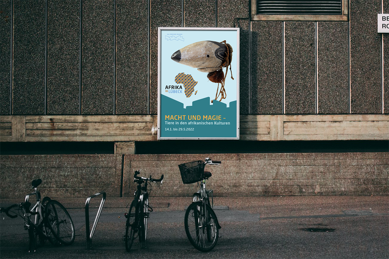 Das Key Visual »Afrika in Lübeck« wird als übergeordnete Gestaltungsklammer für drei unterschiedliche Ausstellungen in drei verschiedenen Museen eingesetzt. Es werden verschiedene Ausstellungen zum Thema »Afrika in Lübeck« im Völkerkundemuseum, im Museum für Natur und Umwelt Lübeck und im St. Annen Museum gezeigt. Damit klar wird, dass es sich hierbei um eine Reihe handelt, wird das entwickelte Key Visual eingesetzt.